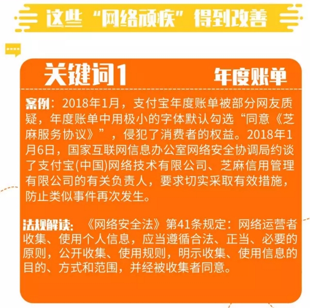 來源:http://www.svqjrzs.cn/news553194.html 發(fā)布時間:2019-06-19 返回列表于2017年6月1日起正式施行的《網(wǎng)絡(luò)安全法》現(xiàn)已實施兩周年。在這兩年時間里,不僅網(wǎng)絡(luò)環(huán)境得到了凈化,而且許多過去無法可依的網(wǎng)絡(luò)案件也有了法律依據(jù)。在《網(wǎng)絡(luò)安全法》實施兩周年之際,來為大家盤點這兩年來哪些“網(wǎng)絡(luò)頑疾”得到了改善。